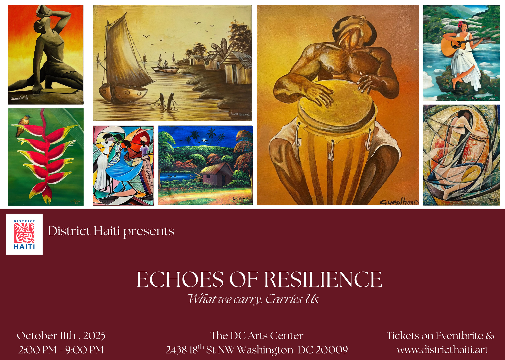 Join us in the heart of Adams Morgan for an evening where art becomes testimony and community becomes celebration. Complimentary drinks and hors d’oeuvres will be served. All artworks will be available for purchase, directly supporting Haitian artists who continue to create against all odds.